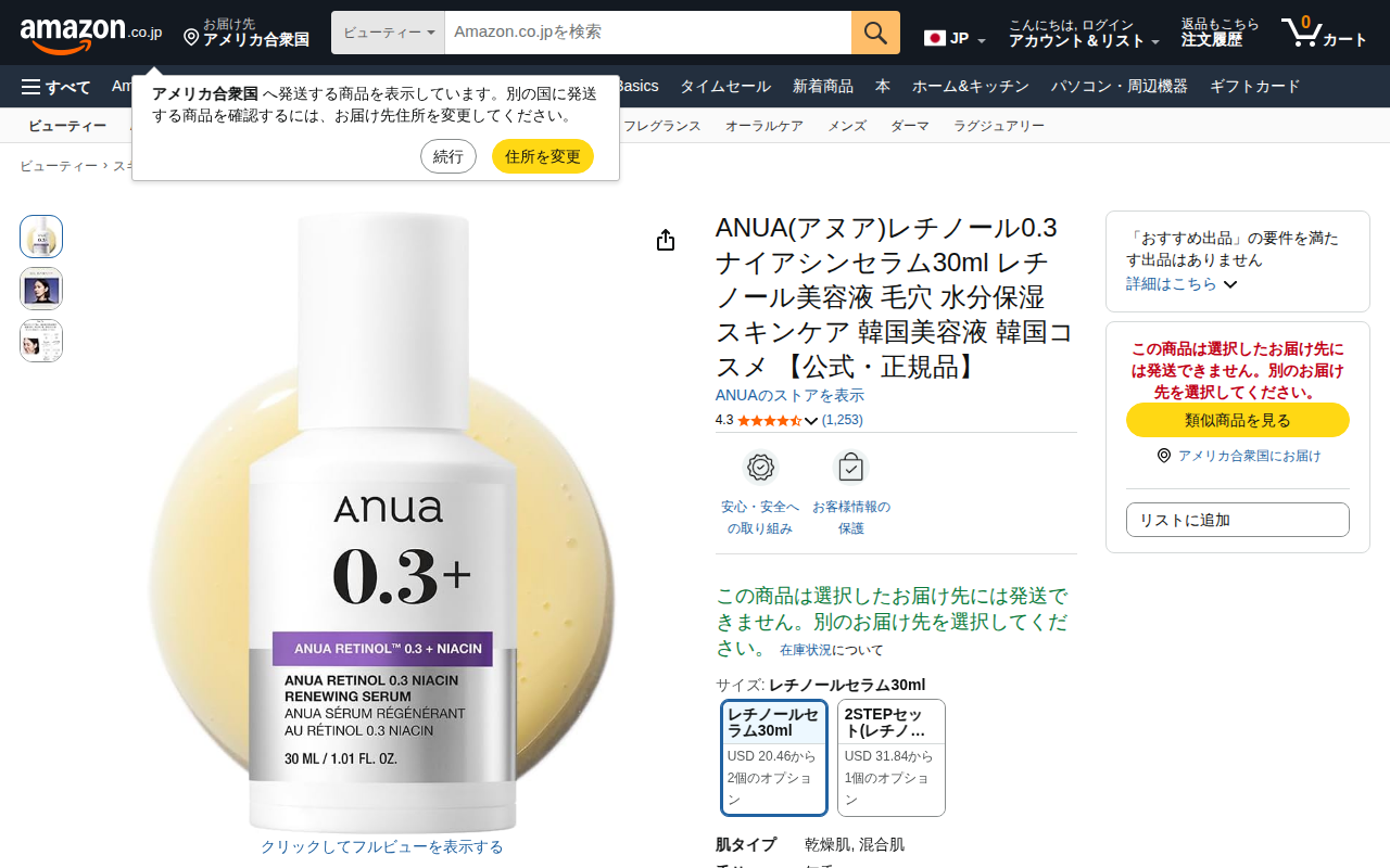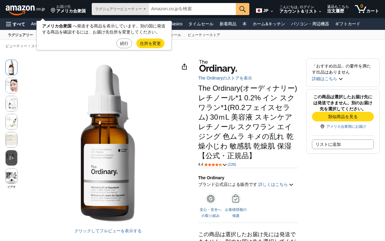 This page presents The Ordinary's Retinol 0.2% in Squalane serum on Amazon.co.jp. It is a water-free facial se...