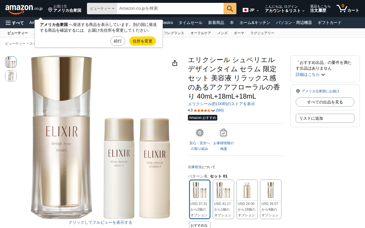 This page presents the Elixir Superior Design Time Serum Limited Set, a beauty serum product available in a 40...