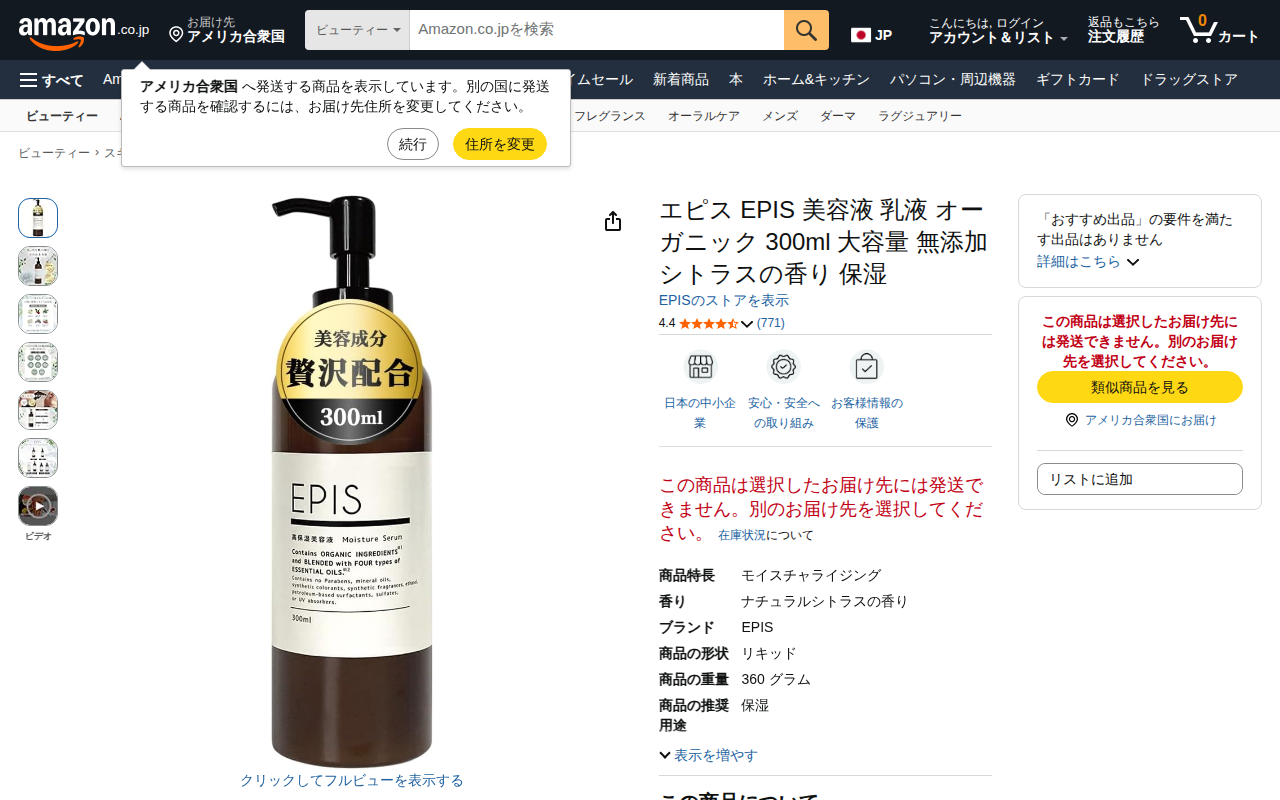 This page presents an EPIS organic beauty serum and emulsion product on Amazon.co.jp. The 300ml moisturizing l...