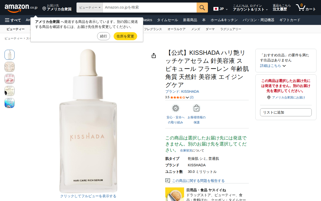 This page displays the KISSHADA Tightening Rich Care Serum on Amazon.co.jp, a needle serum beauty product cont...