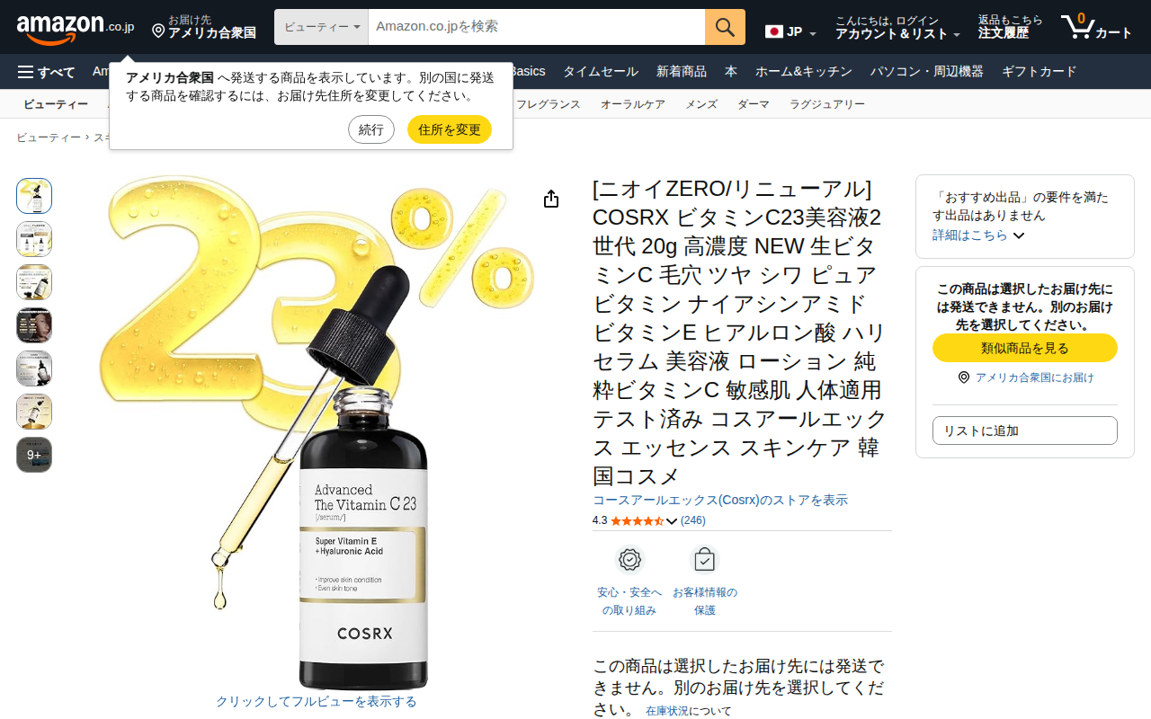 This page displays the Amazon product listing for COSRX Vitamin C23 Essence 2nd Generation, a 20g Korean skinc...