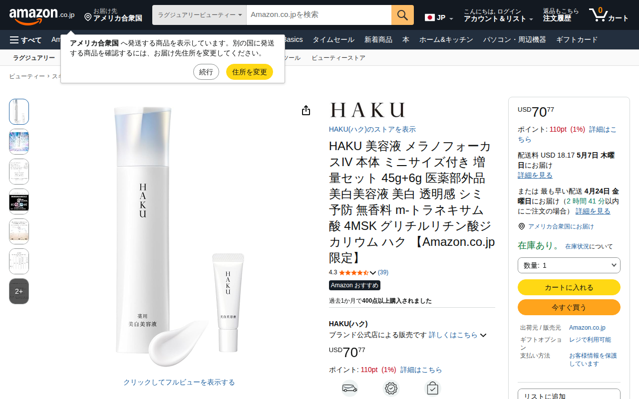 This page showcases HAKU's whitening beauty serum "Melano Focus IV," an Amazon.co.jp exclusive product set con...