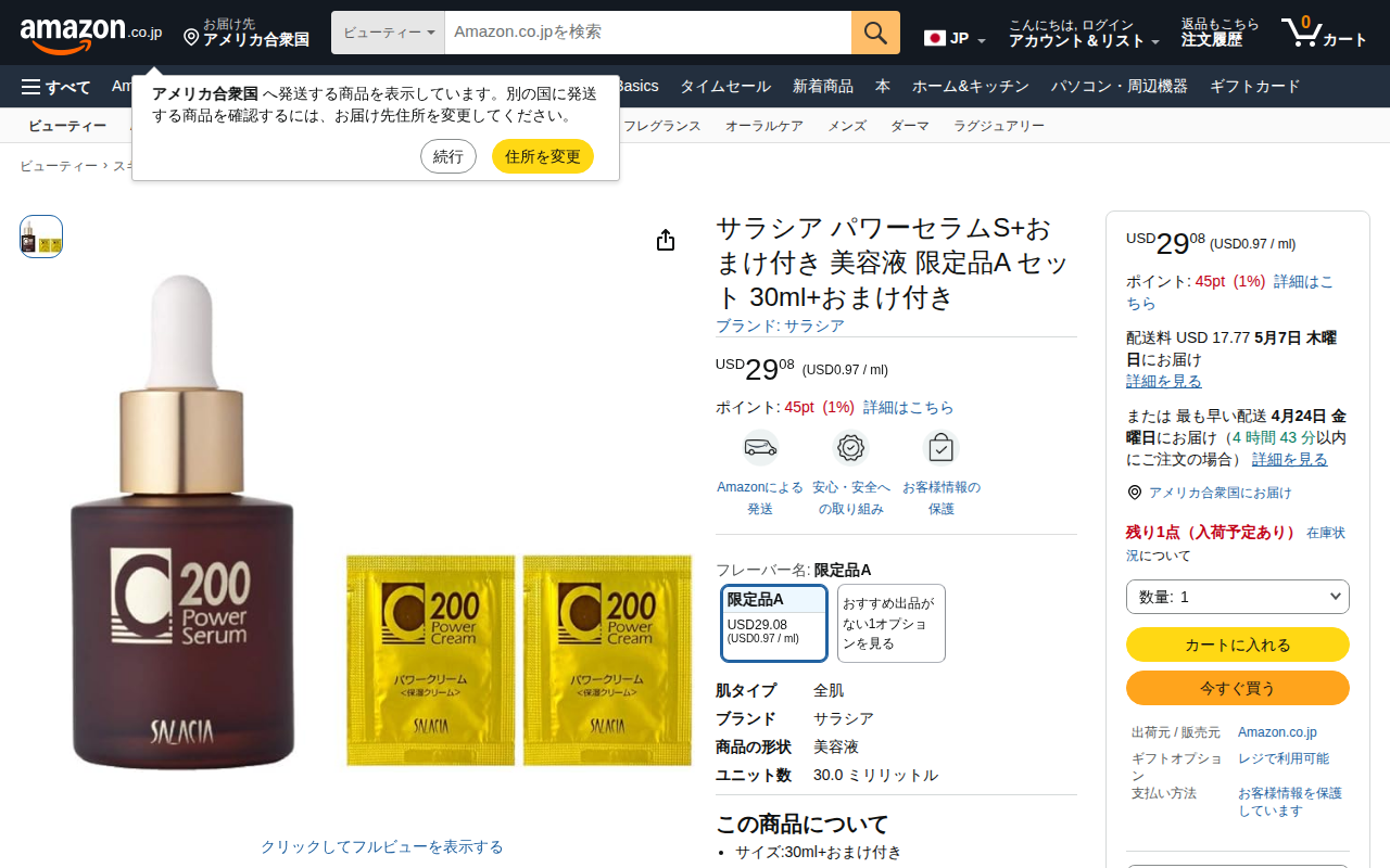 This page is a product listing on Amazon.co.jp for Salacia Power Serum S+ limited edition A set. It is a 30ml ...