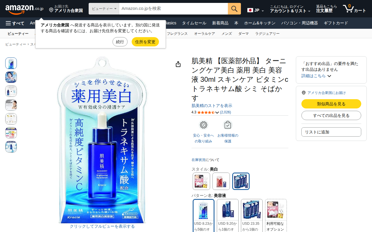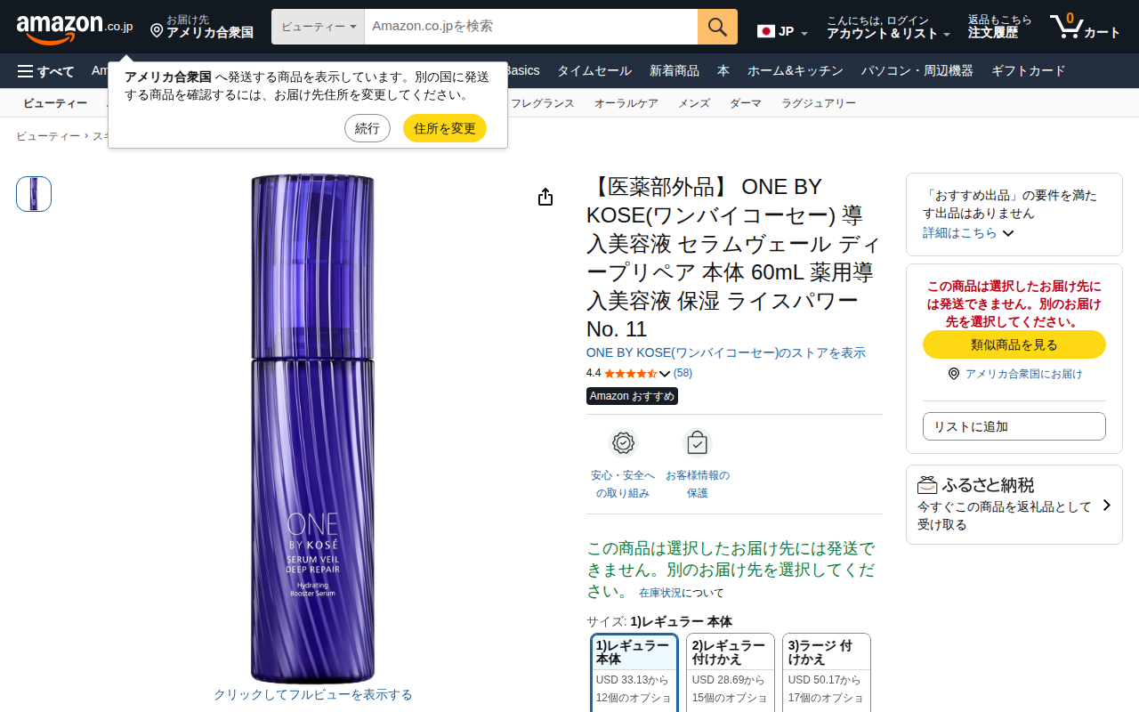 This page shows an Amazon.co.jp product listing for ONE BY KOSE Serum Veil Deep Repair, a quasi-drug beauty se...