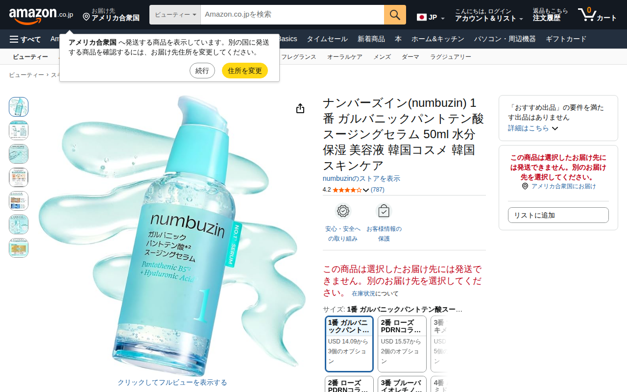 This page is an Amazon product listing for numbuzin No.1 Galvanic Panthenol Soothing Serum (50ml), a Korean be...