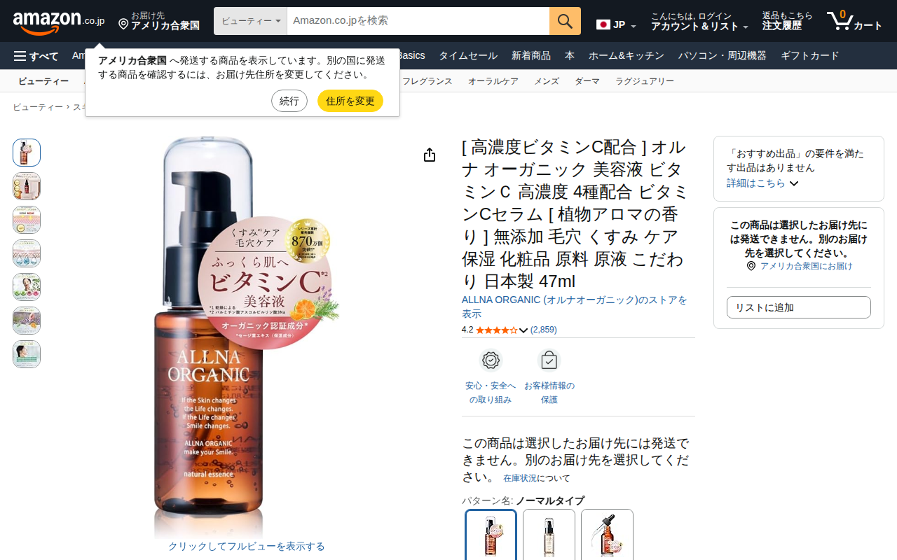 This page presents an ALLNA ORGANIC vitamin C serum product on Amazon. The 47ml serum contains high concentrat...