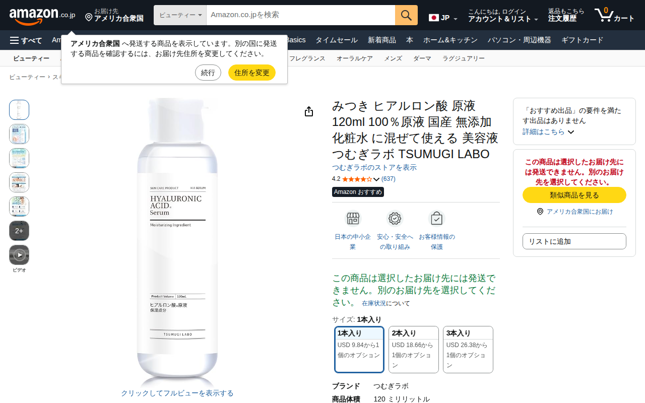 This page shows the Amazon.co.jp product listing for Mitsuki Hyaluronic Acid Serum 120ml by Tsumugi Labo. It i...