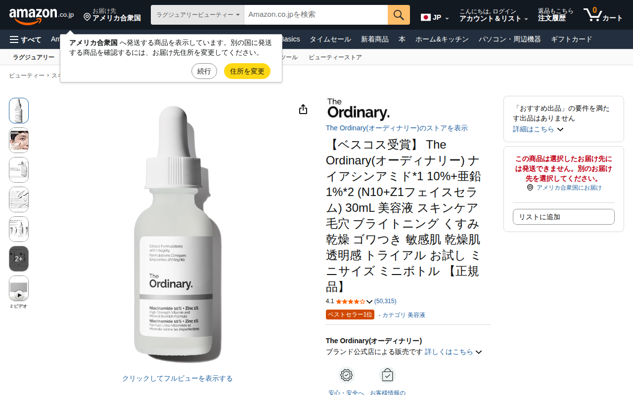 This page presents The Ordinary's Niacinamide 10% + Zinc 1% Face Serum (30mL) on Amazon.co.jp. It is the #1 be...