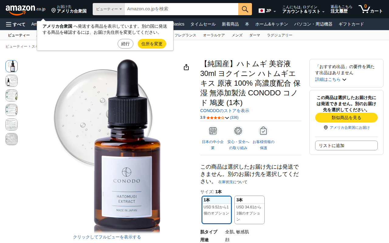 This page showcases CONODO's pure domestic barley beauty essence on Amazon. The 30ml product contains 100% con...