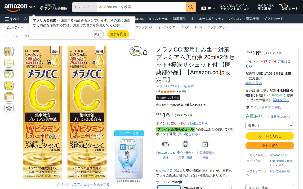 This page presents the Melano CC Medicated Anti-Spot Premium Essence product listing. It is a 20ml×2 piece set...