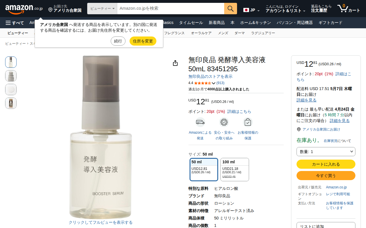This page shows a product listing for Muji's Fermented Introduction Beauty Essence (50mL) on Amazon.co.jp. Pri...