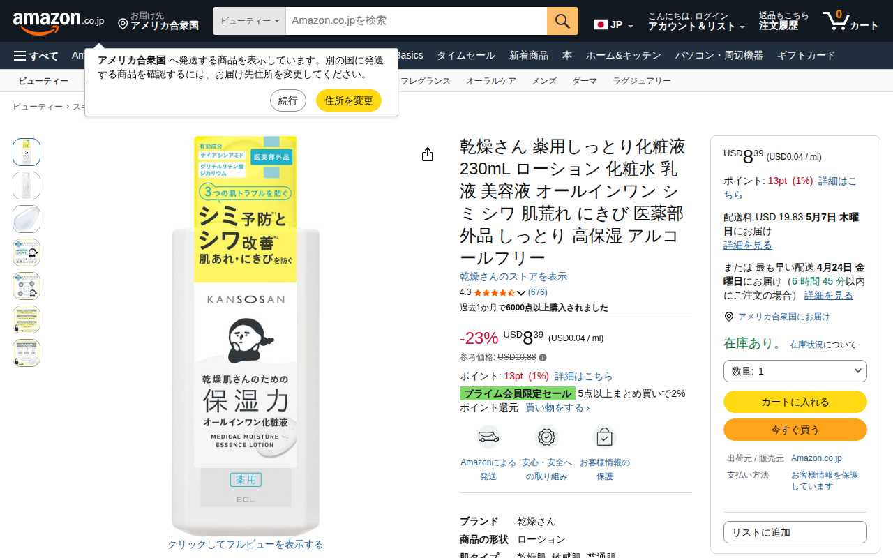 This page presents product information for Kansousan Medicated Moist Lotion (230mL), a quasi-drug skincare ite...