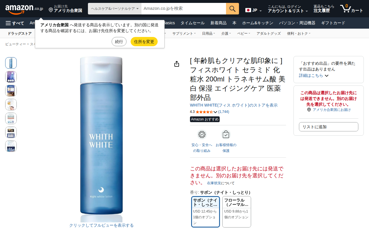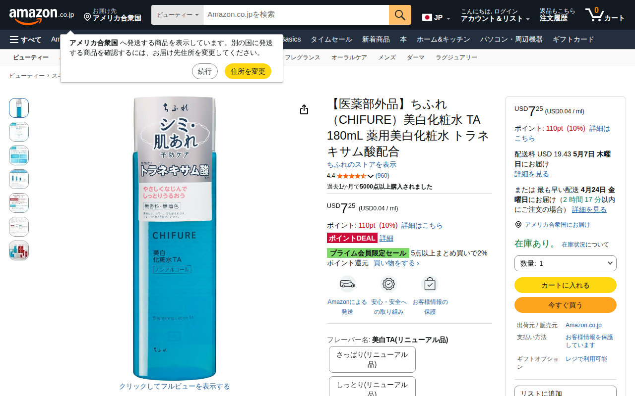 This page is an Amazon product listing for Chifure Medicated Whitening Lotion TA (180mL), a quasi-drug cosmeti...