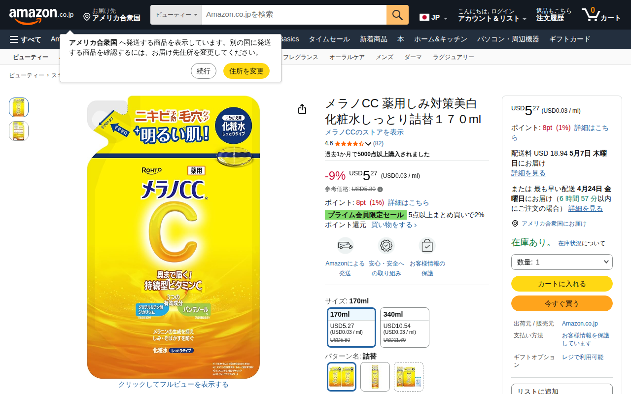 This page presents the Melano CC medicinal whitening lotion refill (170ml) sold on Amazon. It is a brightening...