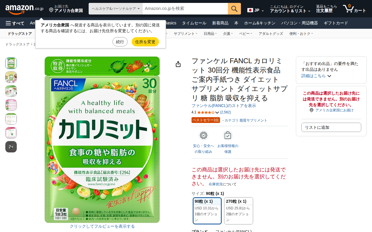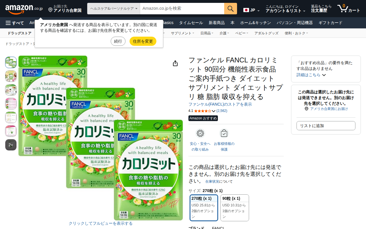 This page presents Fancl's Calorie Limit supplement with 90 servings. It's a functional food that suppresses s...