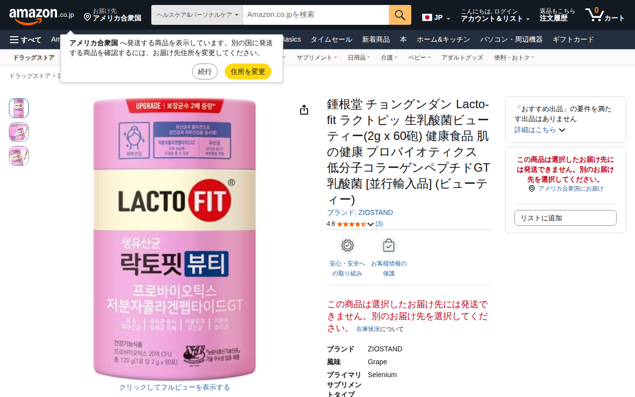 This page showcases the Chong Kun Dang Lacto-fit Beauty probiotic supplement on Amazon Japan, containing 60 pa...