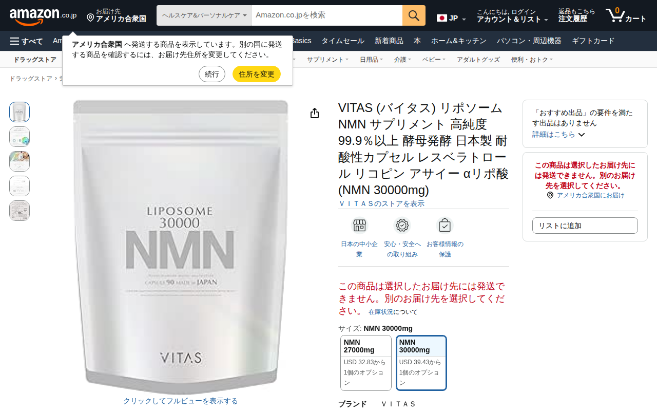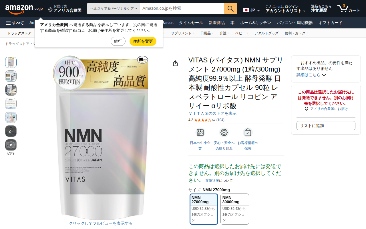 This page displays a VITAS NMN supplement product on Amazon featuring 27,000mg of high-purity NMN (99.9% or hi...