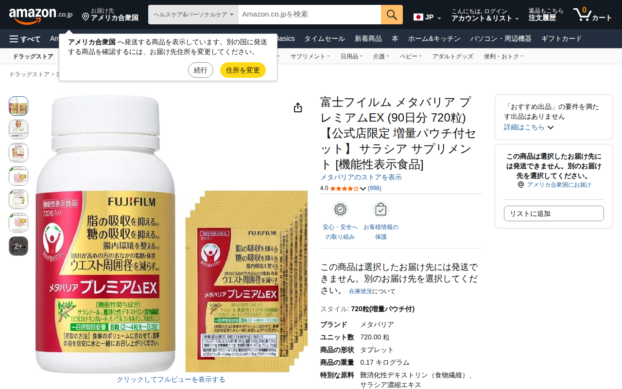 This page presents Fujifilm's Metabarrier EX, a 90-day diet supplement containing 720 tablets. As a functional...