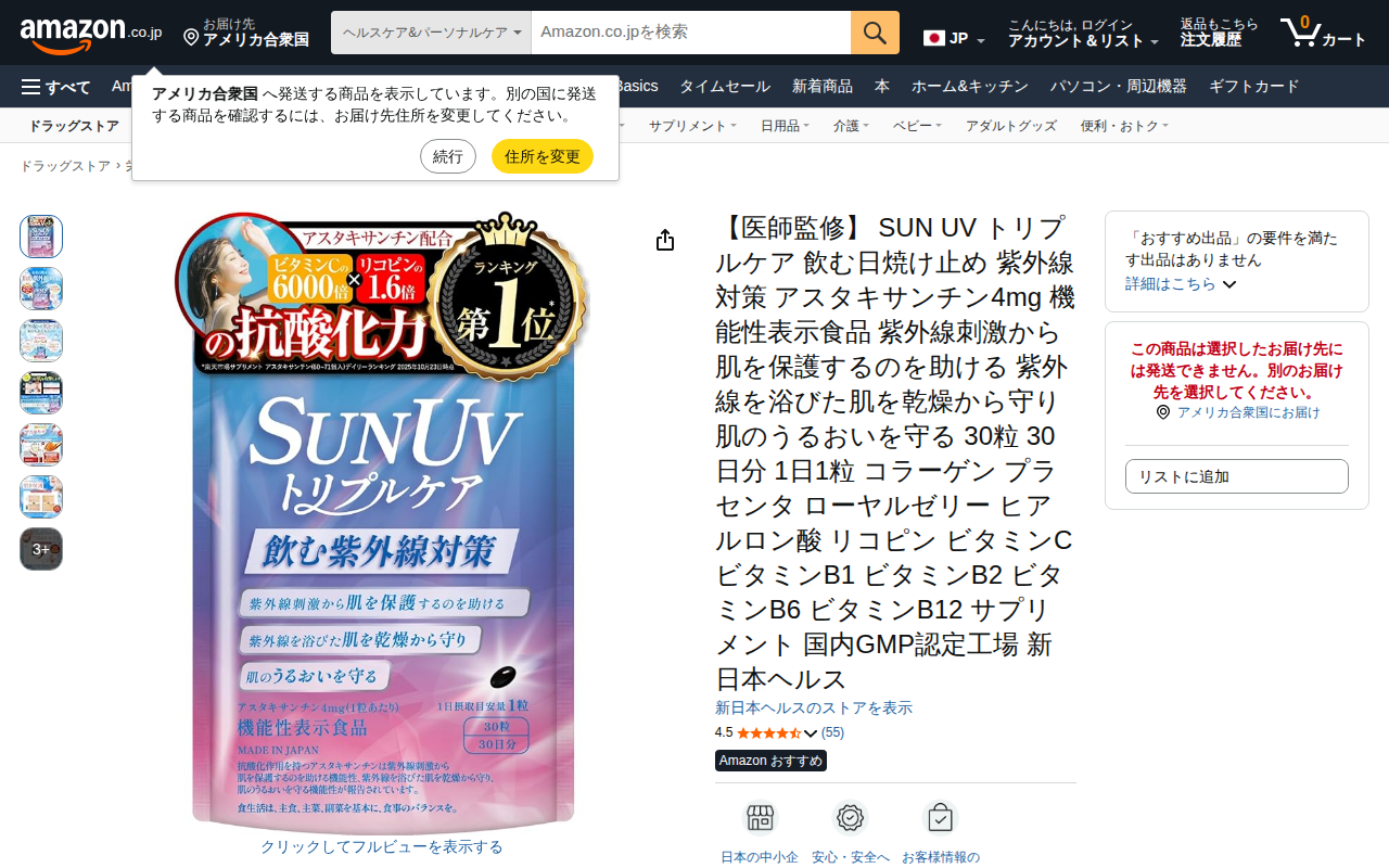 Amazon | 【医師監修】 SUN UV トリプルケア 飲む日焼け止め 紫外線対策 アスタキサンチン4mg 機能性表示食品 紫外線刺激から肌を保護するのを助ける 紫外線を浴びた肌を乾燥から守り肌のうるおいを守る 30粒 30日分 1日1粒 コラーゲン プラセンタ ローヤルゼリー ヒアルロン酸 リコピン ビタミンC ビタミンB1 ビタミンB2 ビタミンB6 ビタミンB12 サプリメント 国内GMP認定工場 新日本ヘルス | 新日本ヘルス | アスタキサンチン