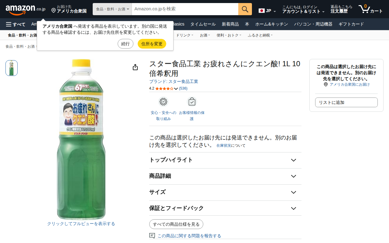 This page presents a sports drink product called "Otsukaresanní Citric Acid!" (1L, 10x dilution) by Star Food ...