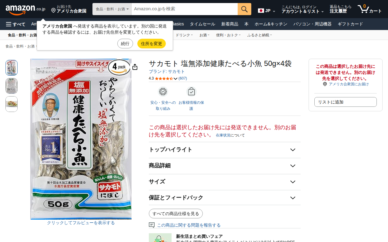 This page showcases Sakamoto's "Salt-Free Healthy Edible Small Fish" product on Amazon.co.jp, available in 50g...