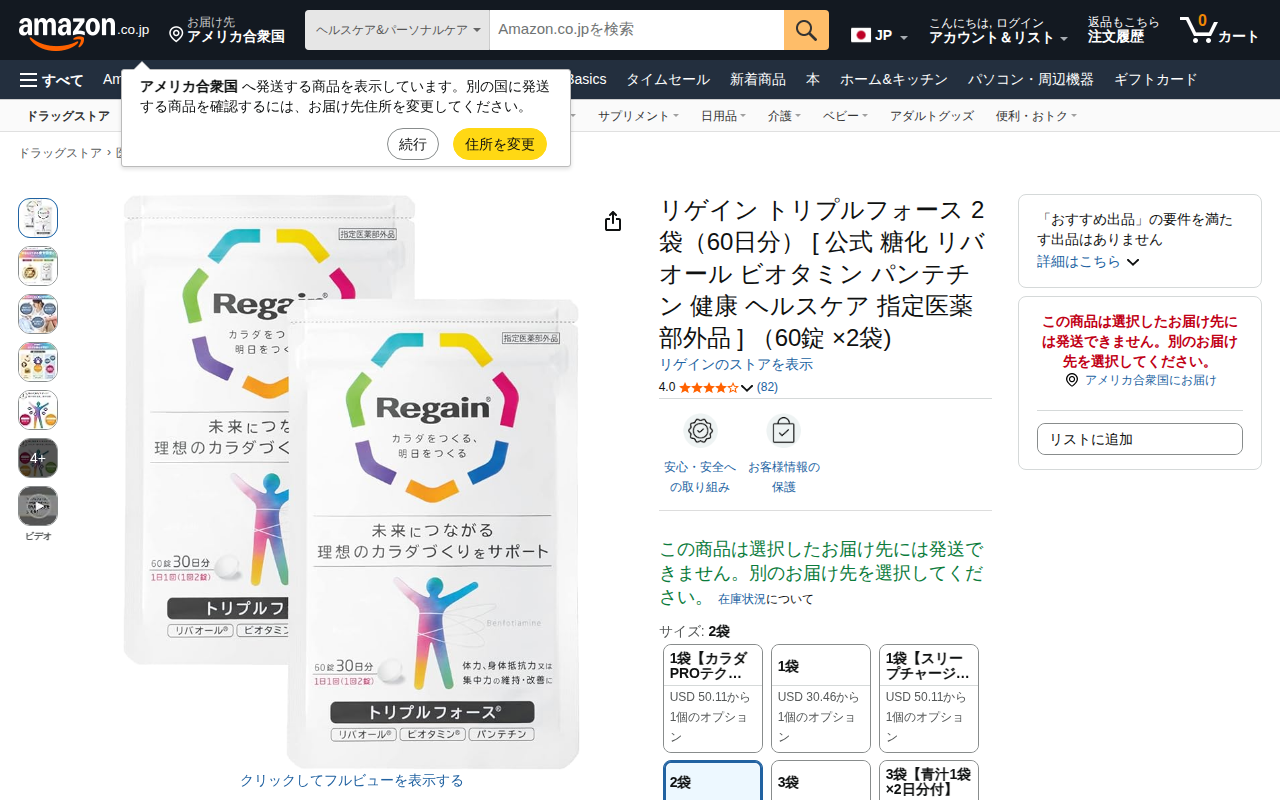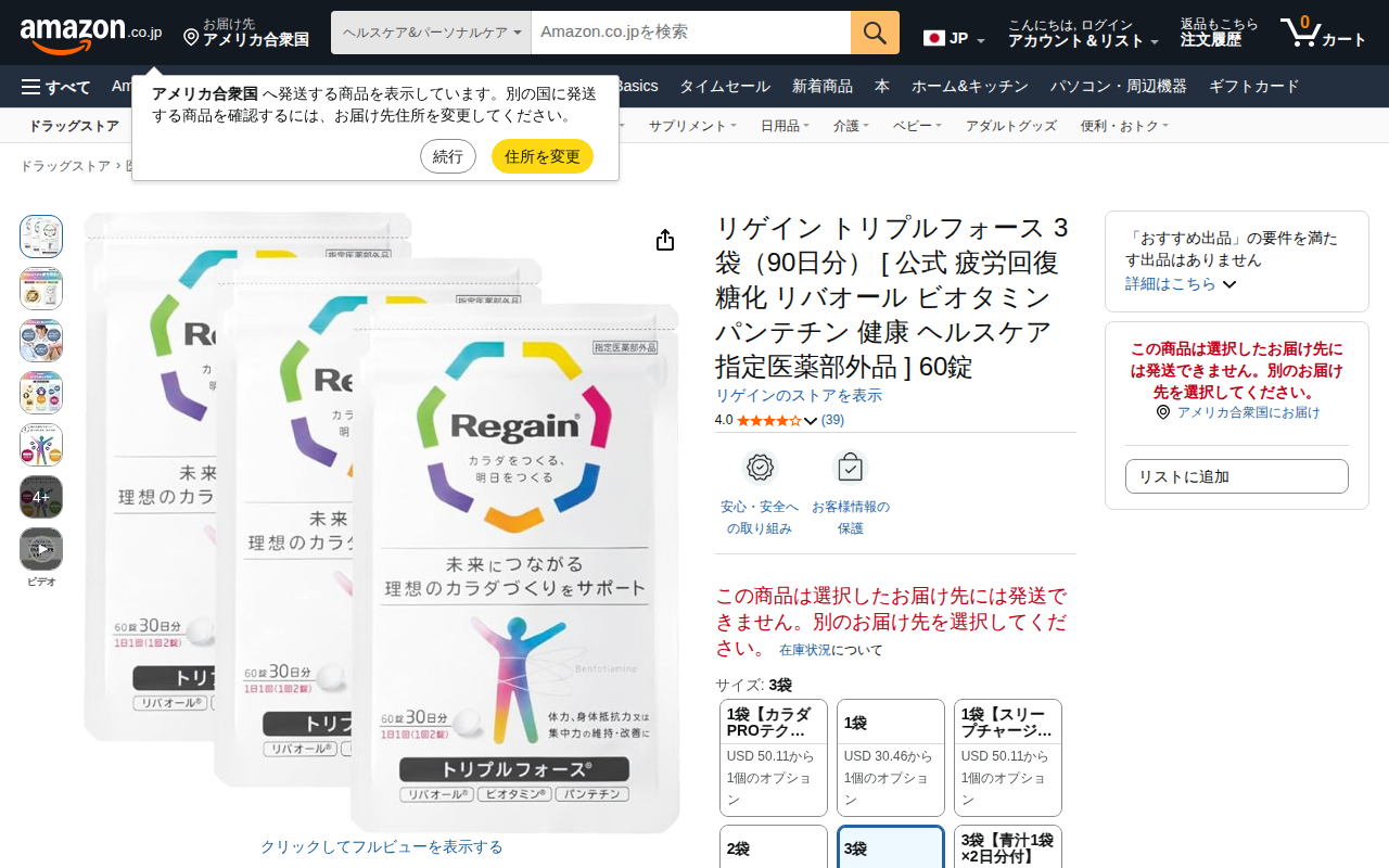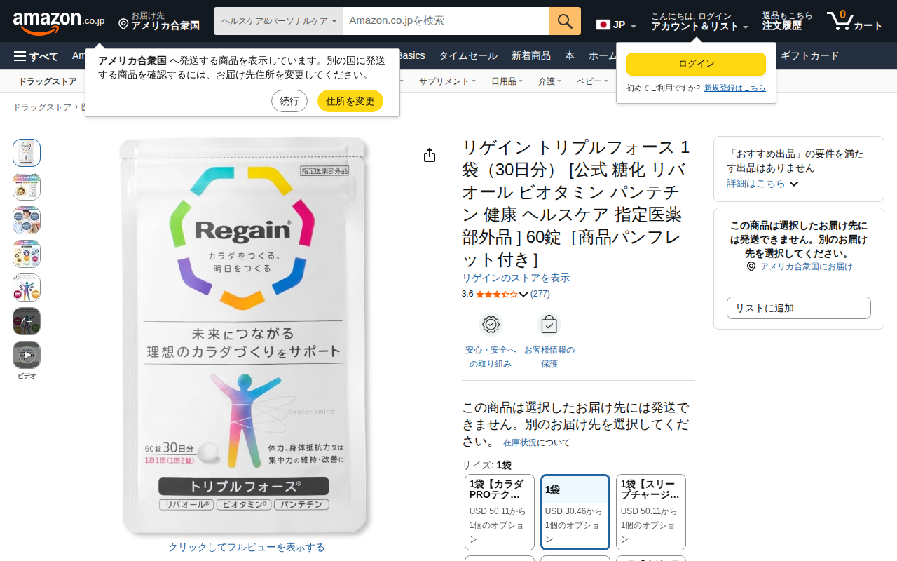 This page presents REGAIN Triple Force, a designated quasi-drug product containing 60 tablets for a 30-day sup...