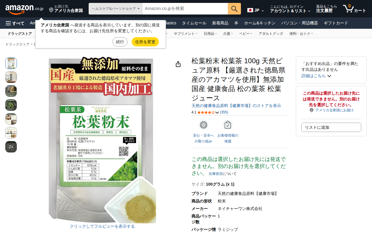 This page features a pine leaf powder tea product (100g) made from Akamatsua pine sourced in Tokushima Prefect...