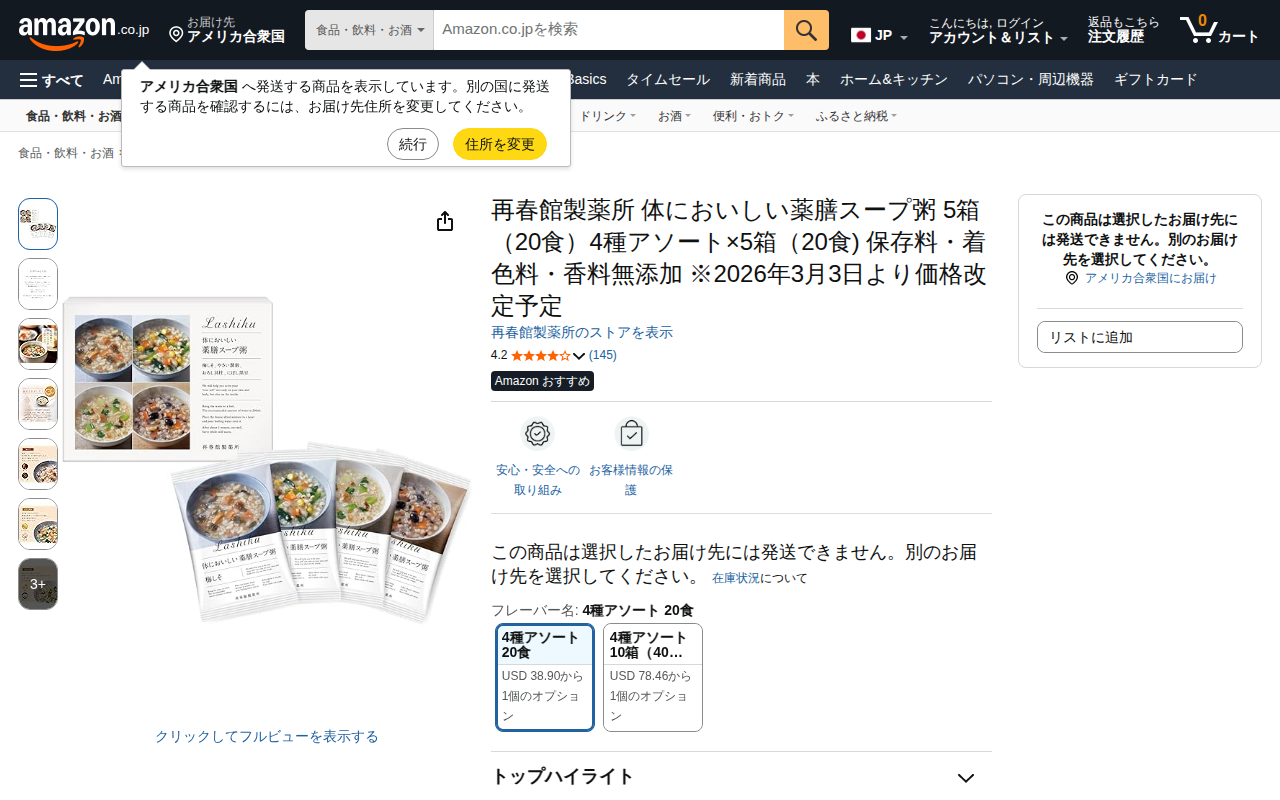 Amazon | 再春館製薬所 体においしい薬膳スープ粥 5箱(20食)4種アソート×5箱(20食) 保存料・着色料・香料無添加 ※2026年3月3日より価格改定予定 | 再春館製薬所 | おかゆ・雑炊 通販