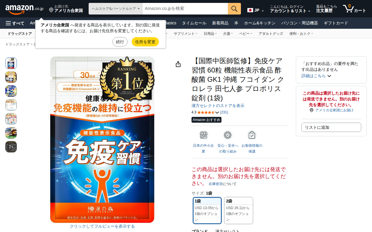This page displays product information for an immune care supplement sold on Amazon by Kampo Select. It is a 6...
