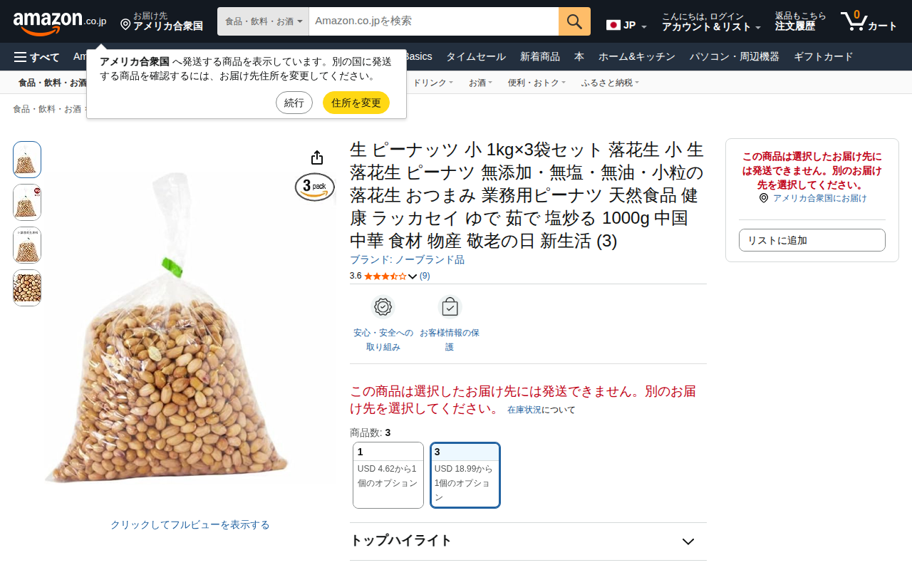 This page is an Amazon.co.jp product listing for raw peanuts (生ピーナッツ). It offers a 3kg set (1kg×3 bags) of sma...