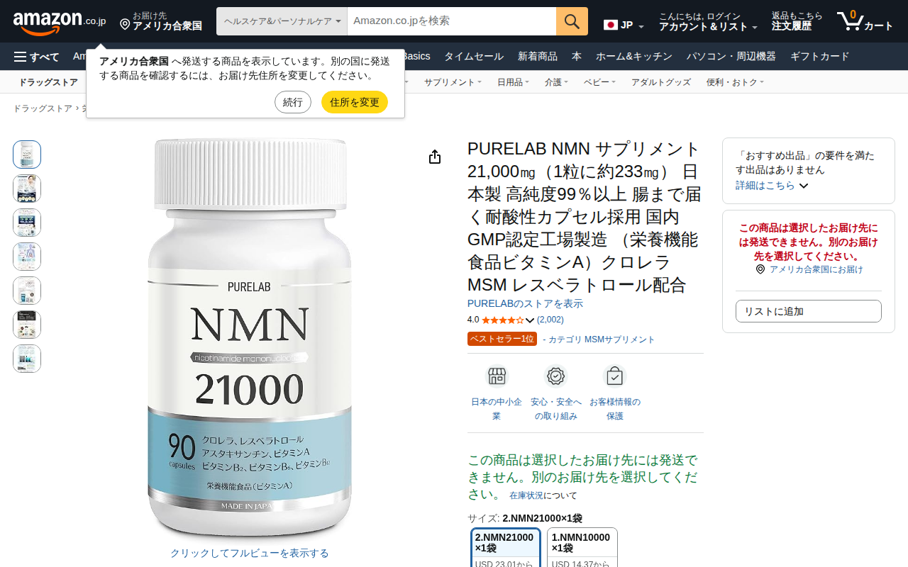 This page presents PURELAB NMN Supplement, a 90-capsule product with 21,000mg of NMN at 99.9% purity or higher...