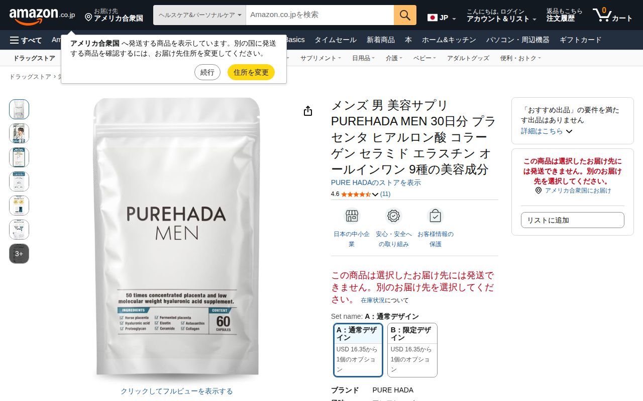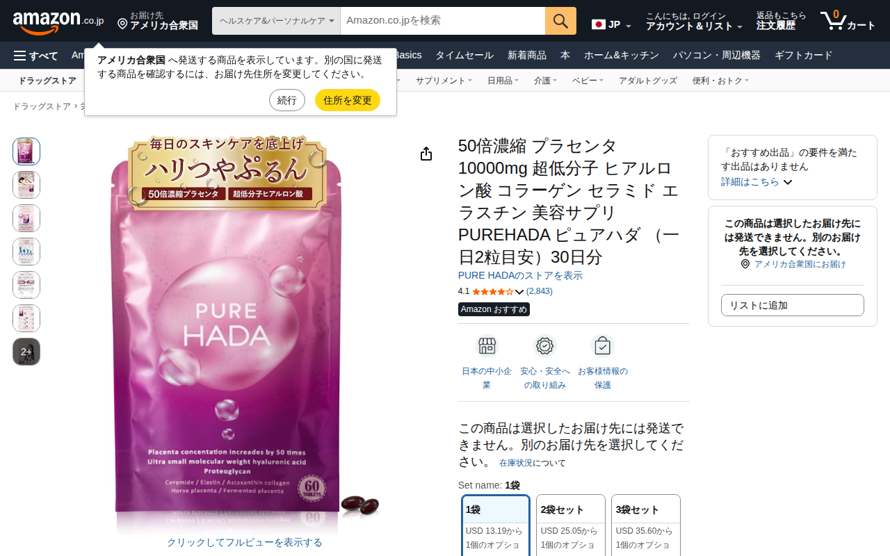 This page presents an Amazon product listing for PURE HADA's beauty supplement containing 50x concentrated pla...