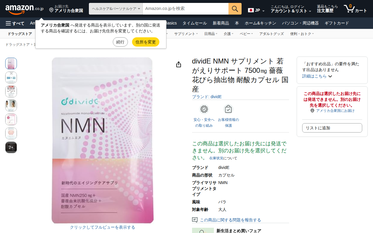 This page displays a NMN supplement product by dividE brand on Amazon. The supplement contains 7500mg of NMN w...