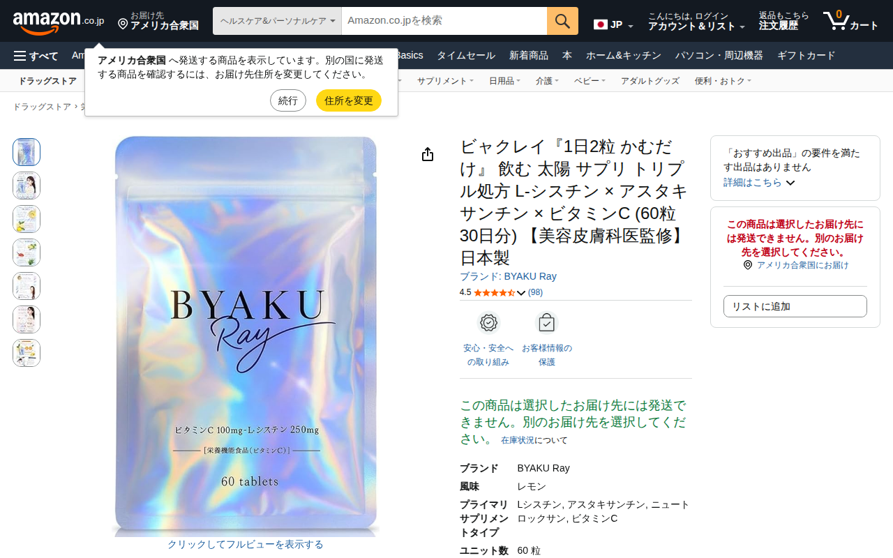This page presents a beauty supplement product by BYAKU Ray available on Amazon. It is a chewable supplement c...