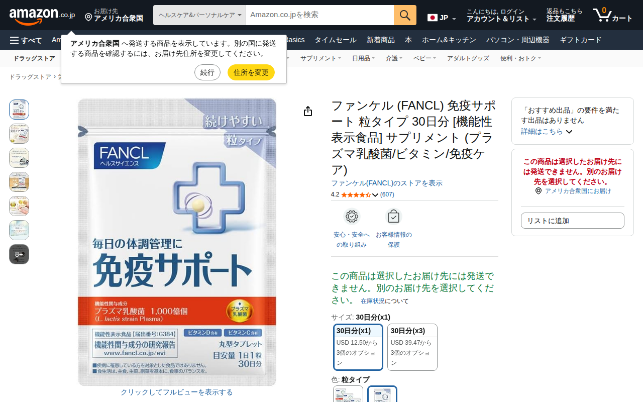 This page presents FANCL's Immunity Support tablet supplement (30-day supply). It is a functional food product...