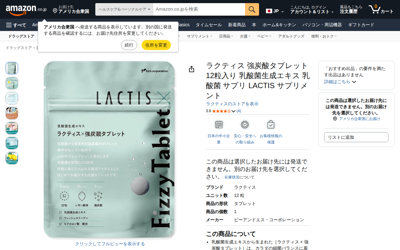 This page presents the LACTIS Strong Carbonated Tablet product on Amazon, developed by B&S Corporation, a lact...