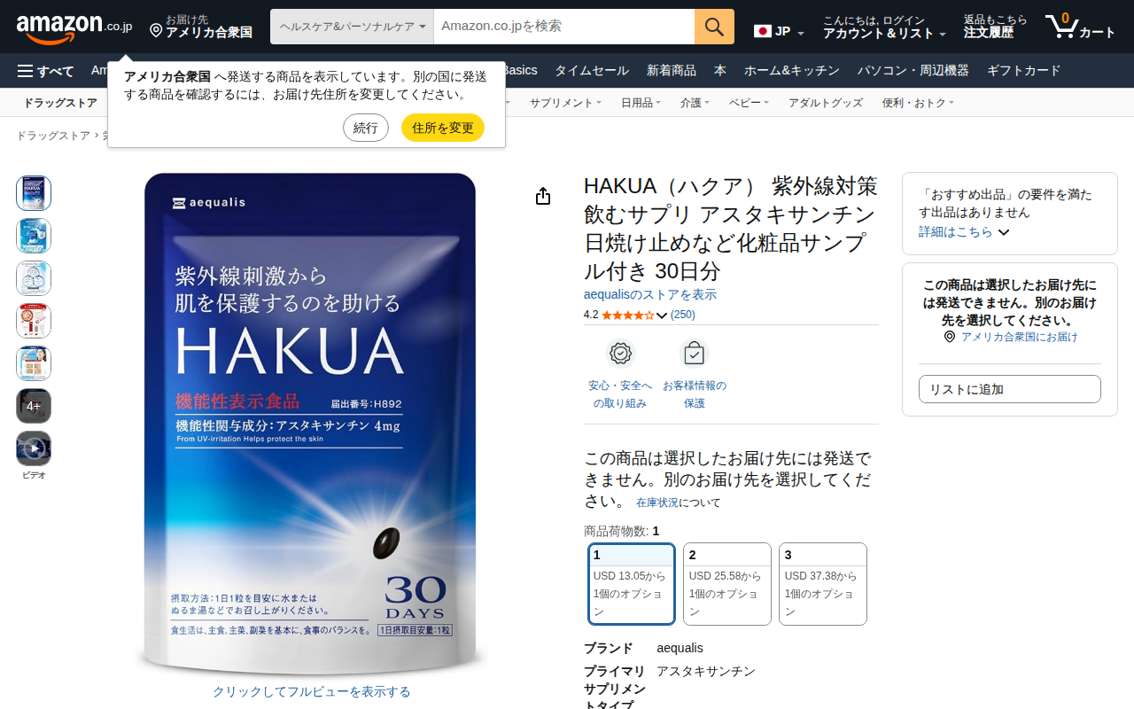 Amazon | HAKUA(ハクア) 紫外線対策 飲むサプリ アスタキサンチン 日焼け止めなど化粧品サンプル付き 30日分 | aequalis | アスタキサンチン