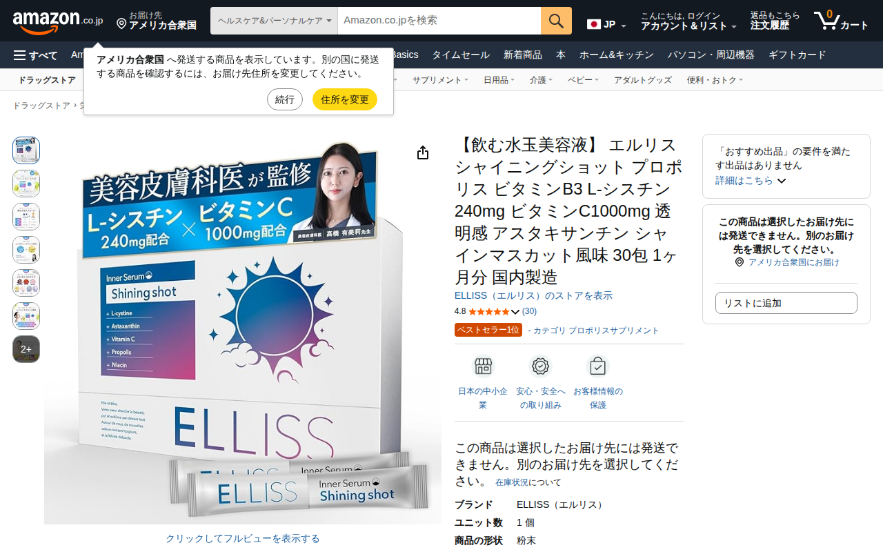 Amazon | 【飲む水玉美容液】 エルリス シャイニングショット プロポリス ビタミンB3 L-シスチン240mg ビタミンC1000mg 透明感 アスタキサンチン シャインマスカット風味 30包 1ヶ月分 国内製造 | ELLISS(エルリス) | プロポリス