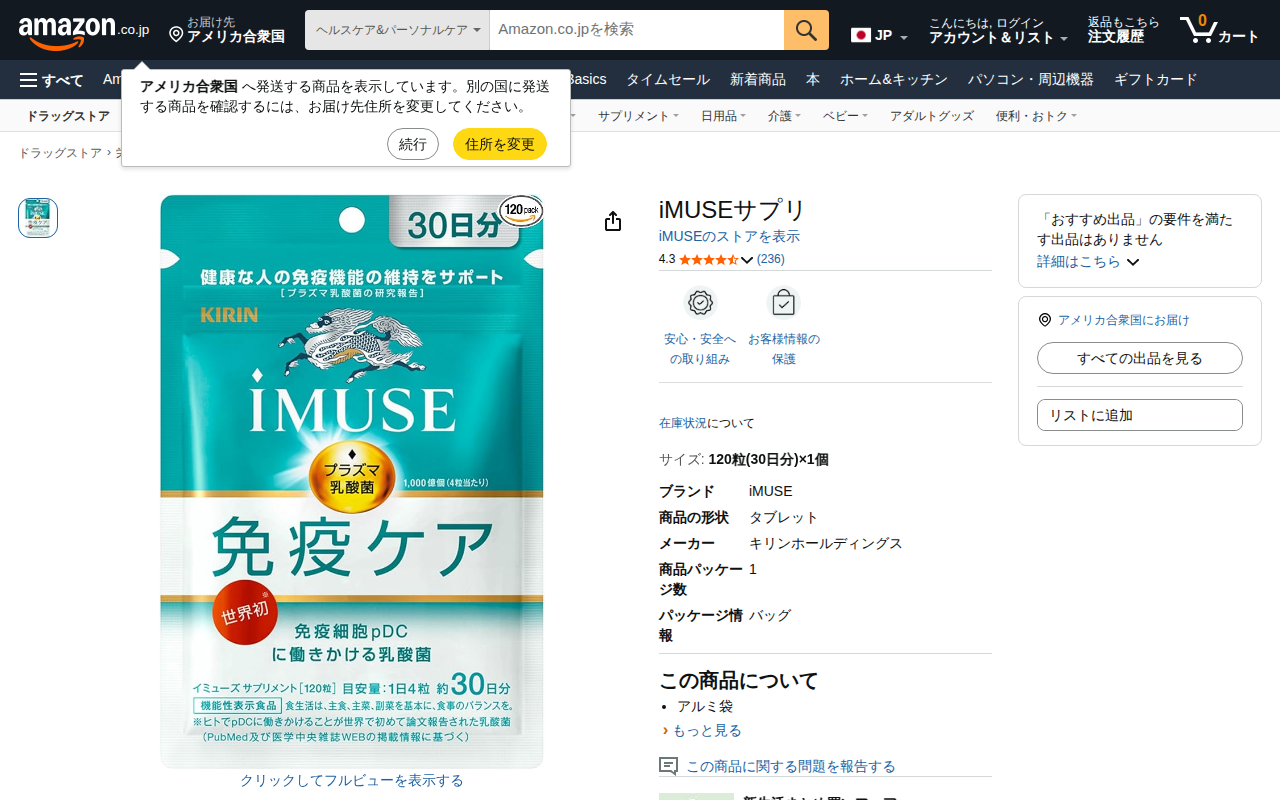 This page is an Amazon.co.jp product listing for iMUSE Supplement, a probiotic supplement manufactured by Kiri...