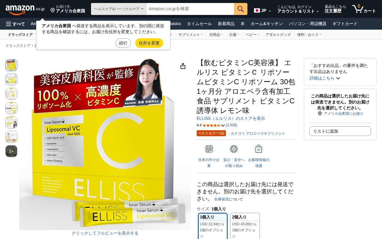 This page features ELLISS's liposomal vitamin C supplement sold on Amazon. As a drinkable vitamin C beauty liq...
