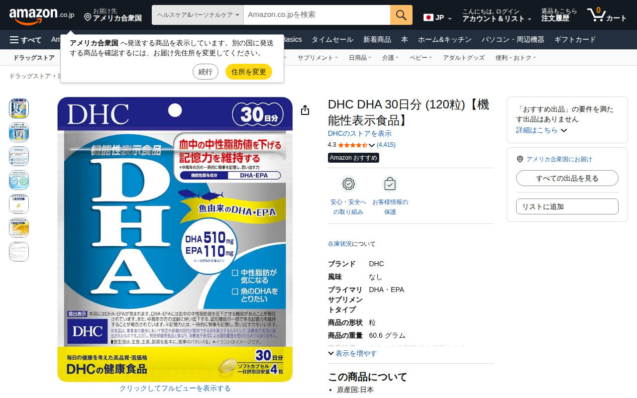This page is an Amazon product listing for DHC DHA 30-day supply supplement. It is a food with function labeli...