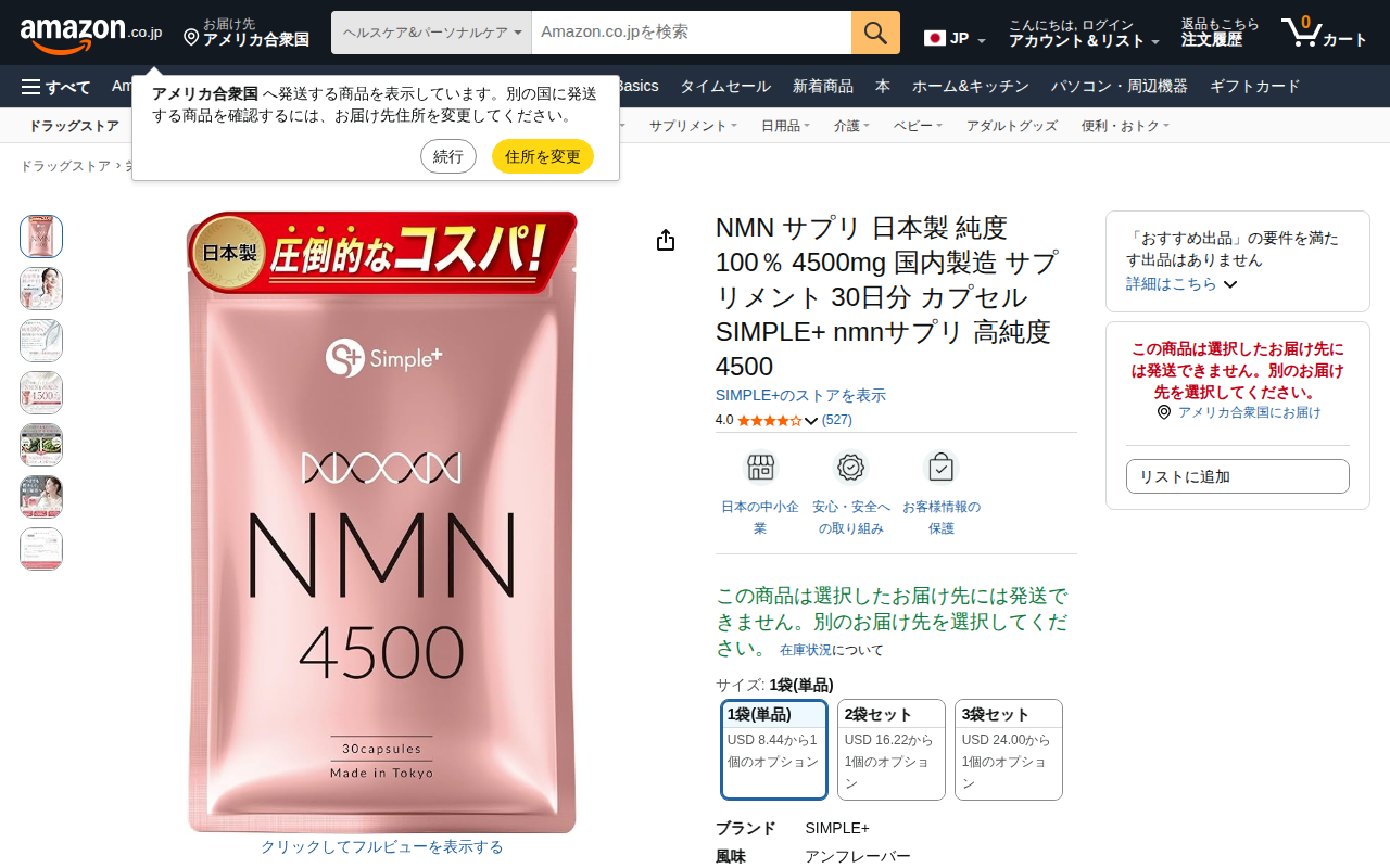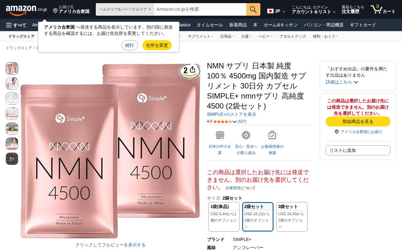 This page presents a SIMPLE+ brand NMN supplement product (2-bag set) on Amazon. The product is manufactured i...