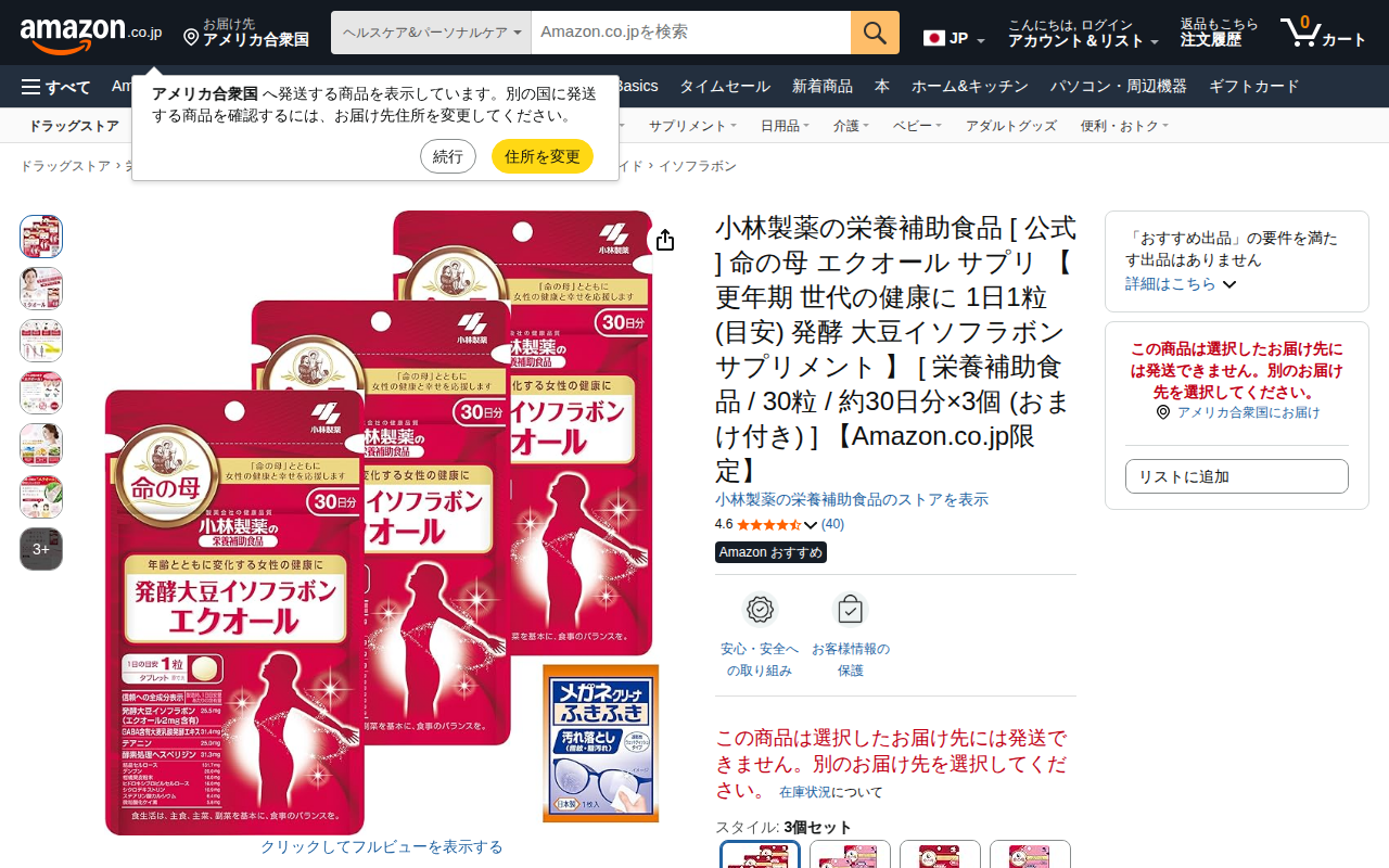 This page features Kobayashi Pharmaceutical's "Inochi no Haha Equol" supplement on Amazon.co.jp. Designed for ...