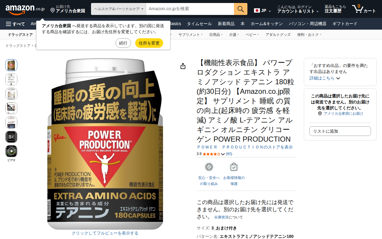 This page displays an Amazon product listing for POWER PRODUCTION Extra Amino Acid Theanine, containing 180 ta...