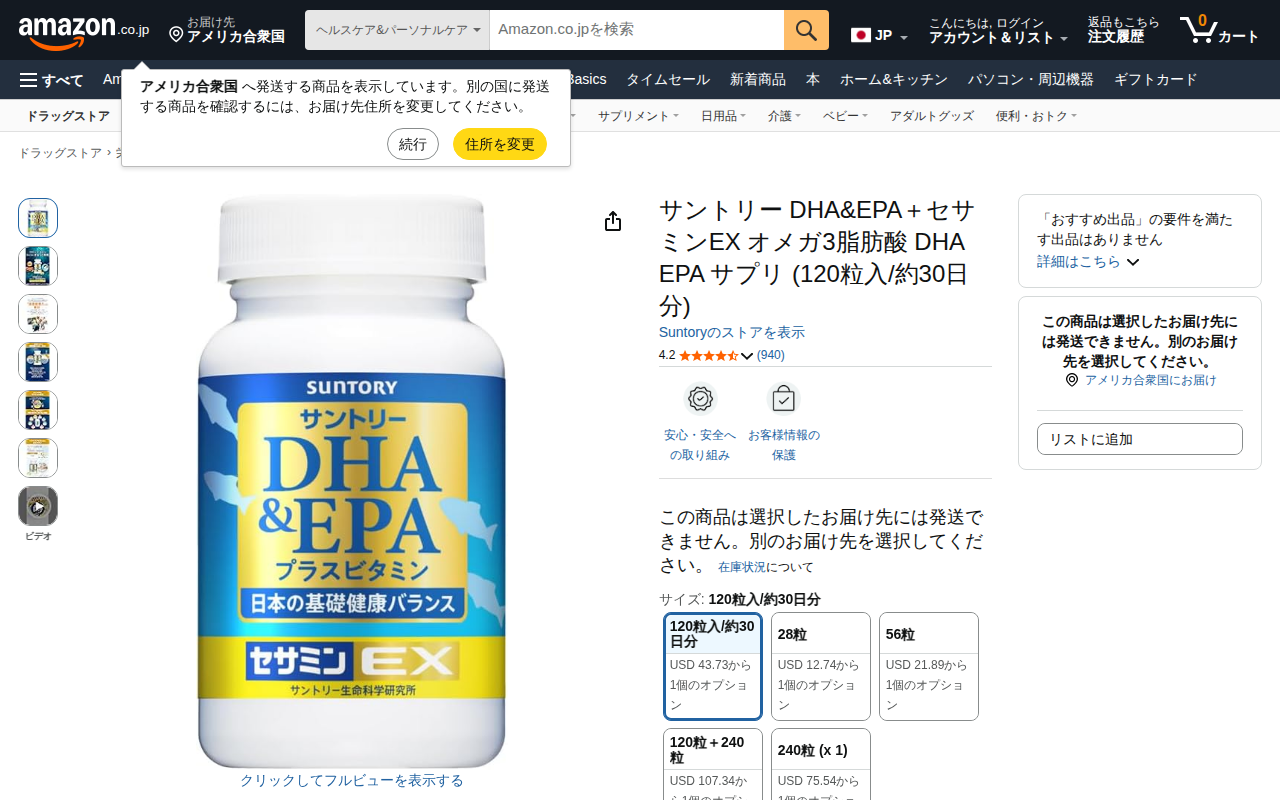 Suntory サントリー DHA&EPA+セサミンEX オメガ3脂肪酸サプリ 120粒