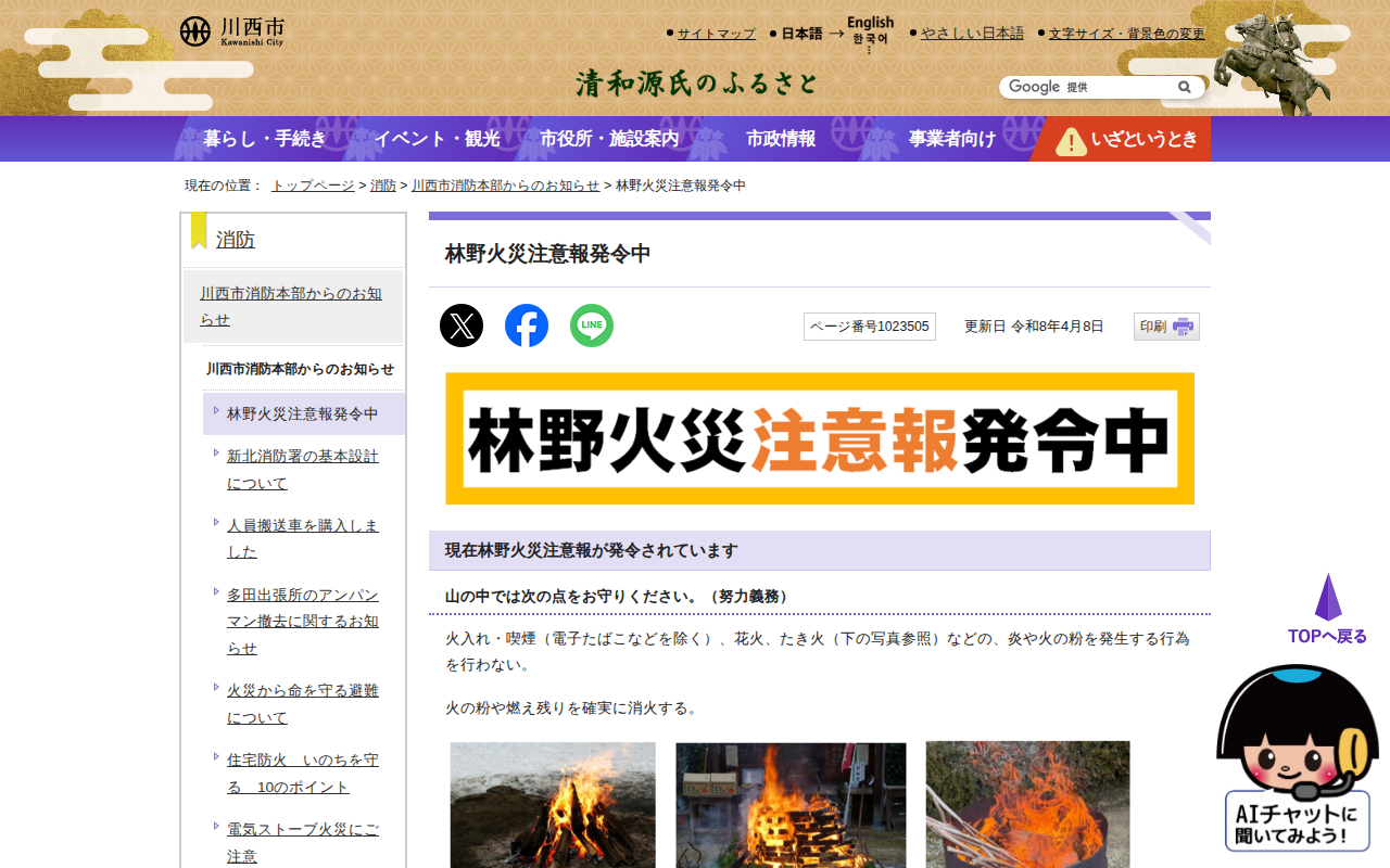 林野火災注意報発令中|川西市