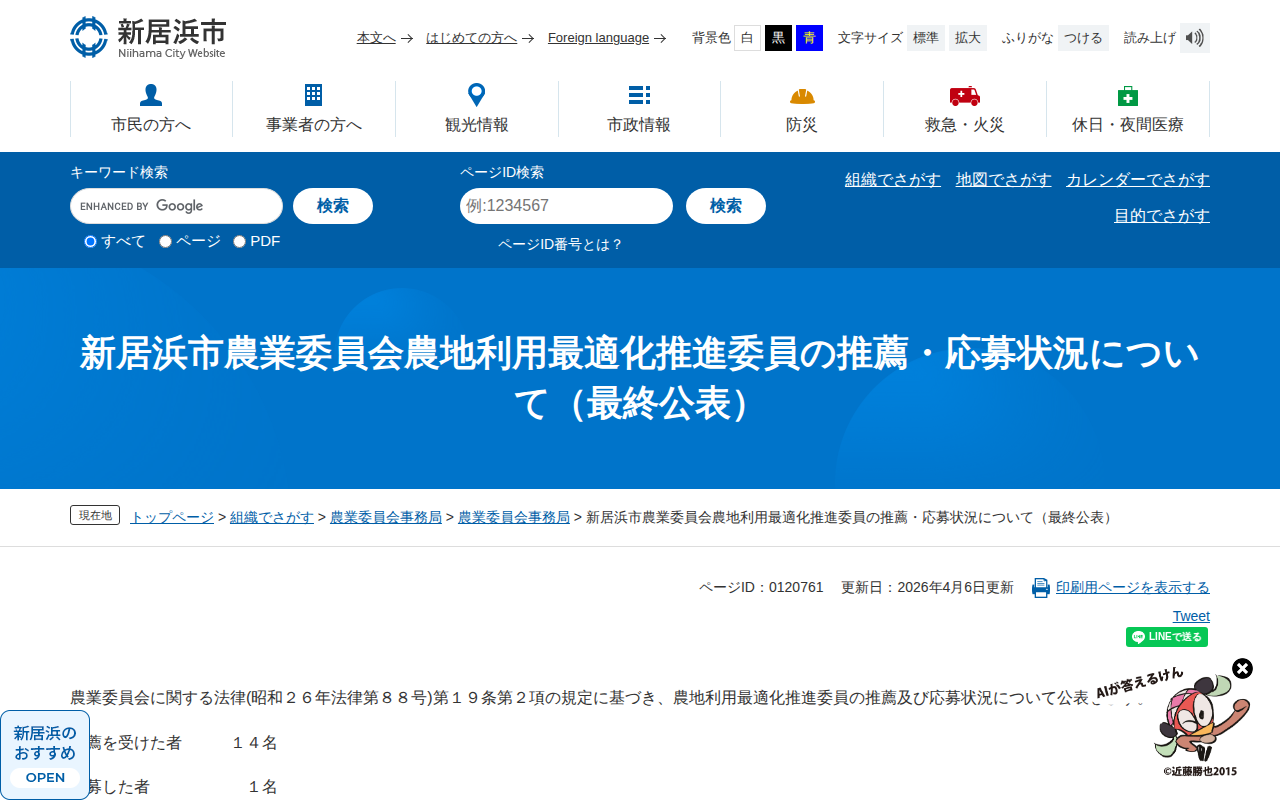 新居浜市農業委員会農地利用最適化推進委員の推薦・応募状況について(最終公表) - 愛媛県新居浜市ホームページ|四国屈指の臨海工業都市
