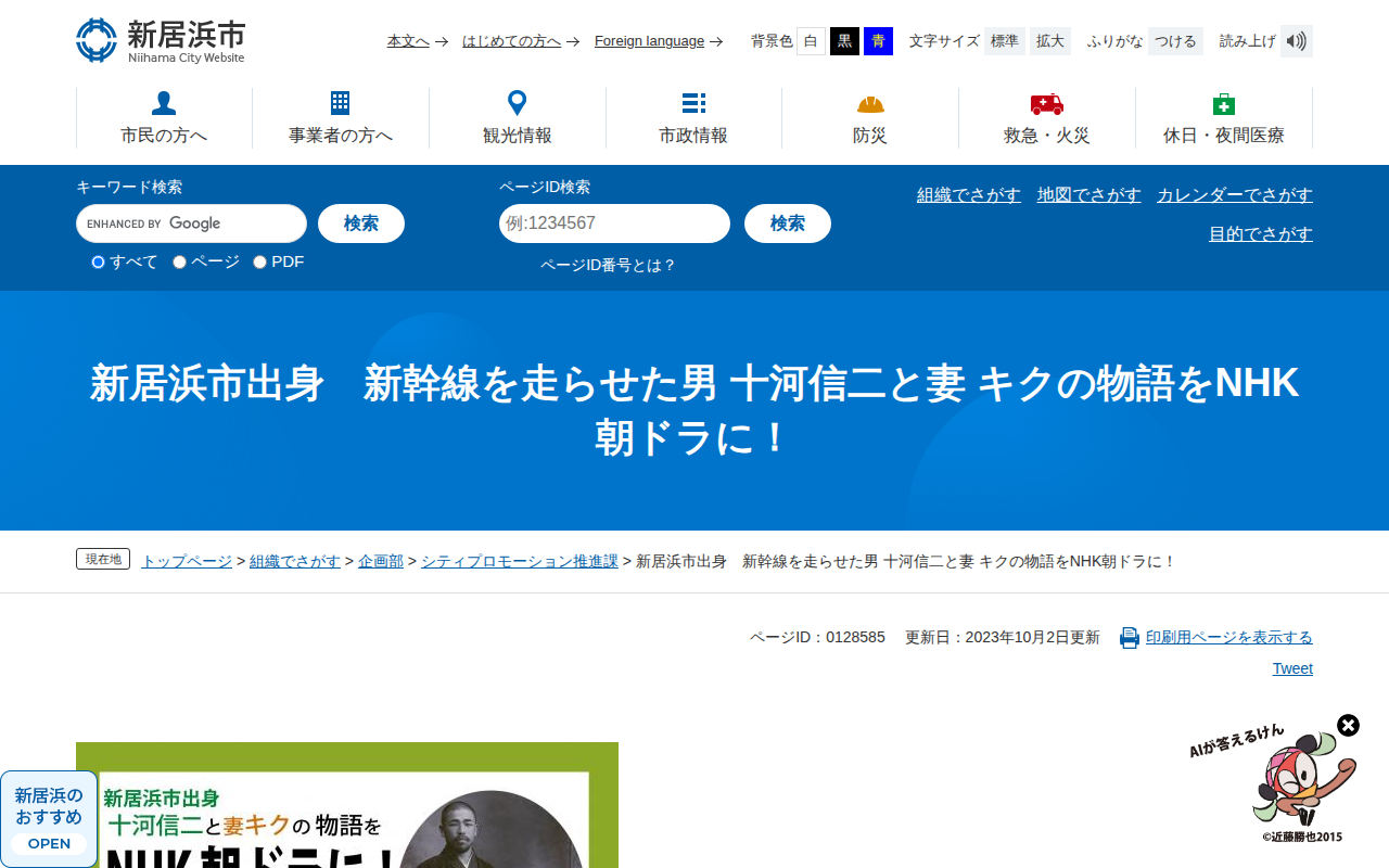 新居浜市出身 新幹線を走らせた男 十河信二と妻 キクの物語をNHK朝ドラに! - 愛媛県新居浜市ホームページ|四国屈指の臨海工業都市