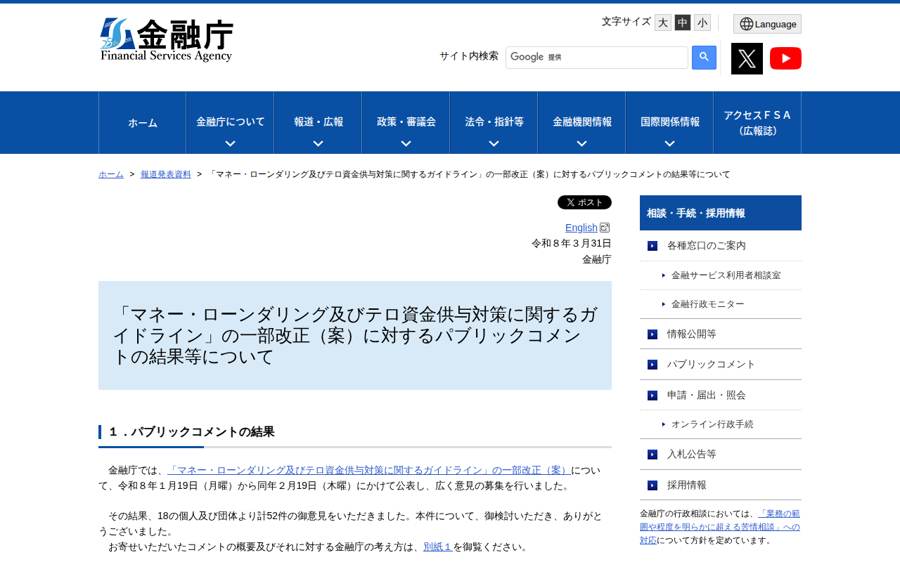 「マネー・ローンダリング及びテロ資金供与対策に関するガイドライン」の一部改正(案)に対するパブリックコメントの結果等について:金融庁