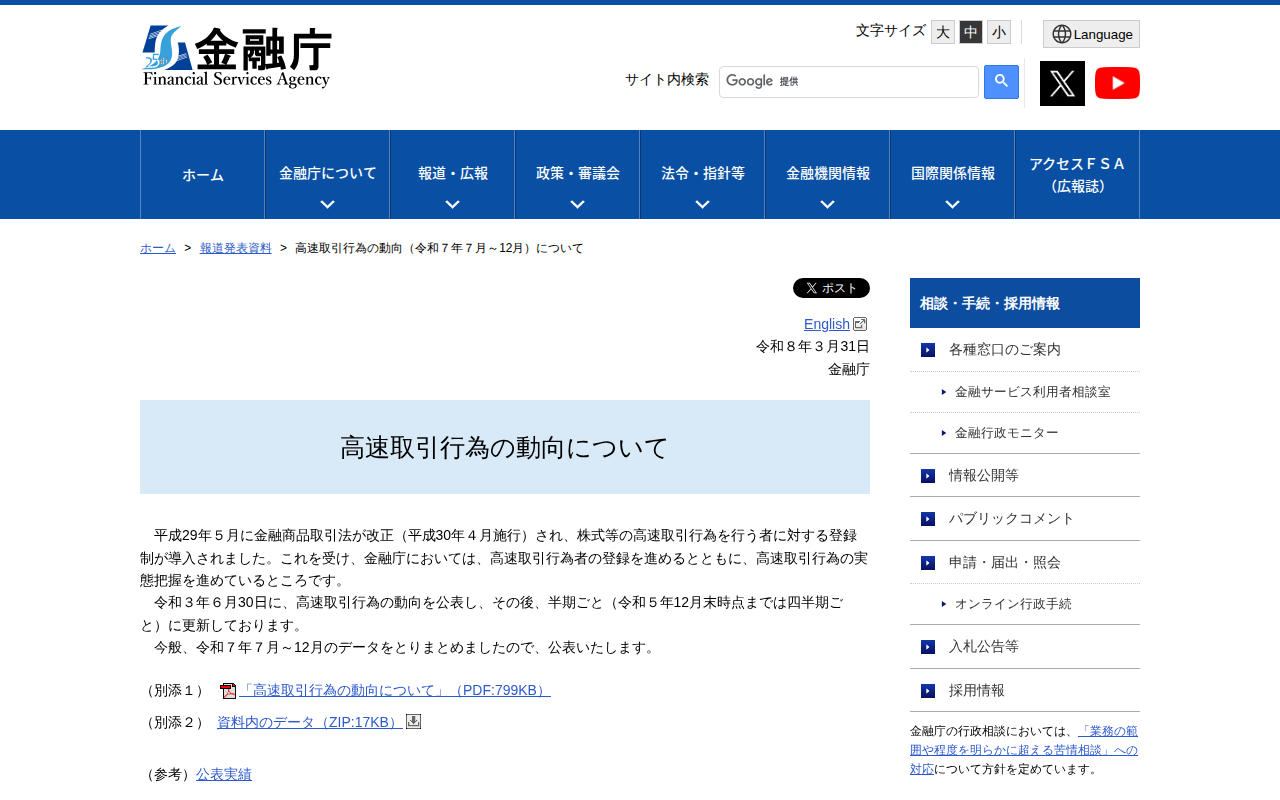 高速取引行為の動向(令和7年7月~12月)について:金融庁